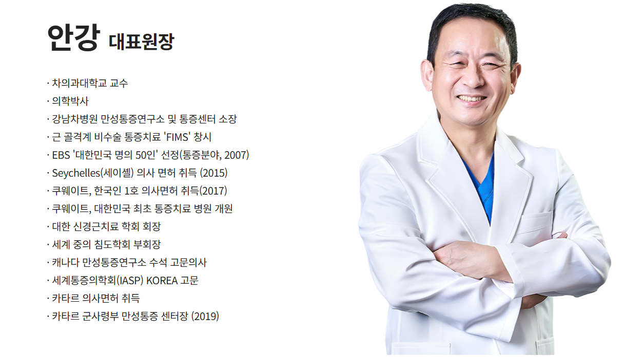 안강 원장의 의료 경력은 ‘통증’이라는 하나의 키워드로 관통됩니다. 그는 차의과대학교 강남차병원 교수 및 만성통증센터장을 역임하며, 기존 통증 치료의 한계를 체감했다고 알려져 있습니다. 이후 약물 의존도를 낮추고 인체의 회복 메커니즘을 자극하는 방향으로 연구를 집중했고, 그 결과물이 바로 기능적 근육내 자극 치료법으로 불리는 FIMS입니다. 이 치료법은 세계적인 통증 의학자 존 건(Gunn) 박사의 이론을 토대로 발전했으며, 안강 원장은 이를 국내 실정과 임상 경험에 맞게 체계화했습니다.